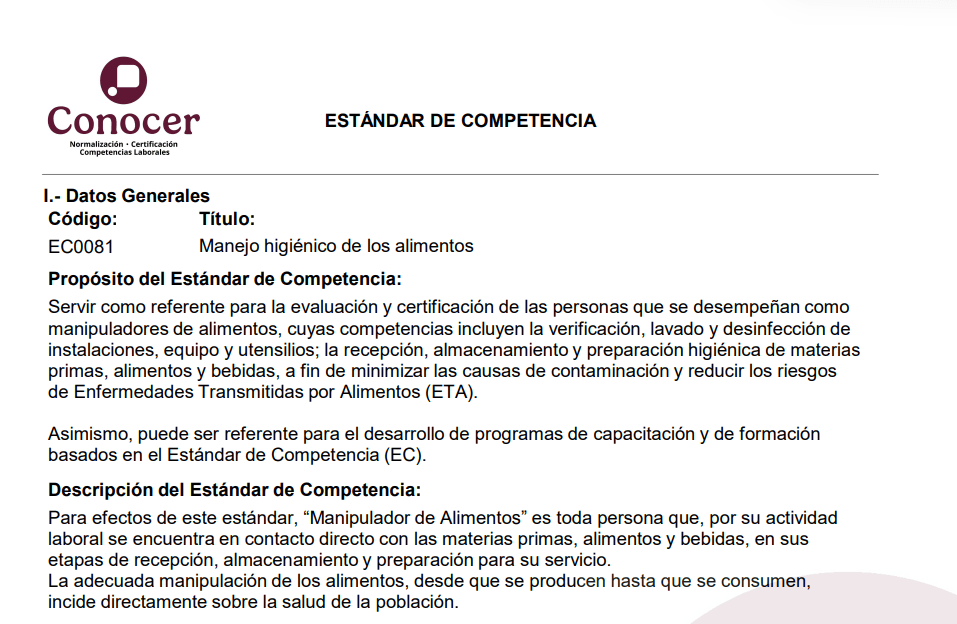 Este estándar reconoce a personas que realizan la recepción, almacenamiento y preparación higiénica de alimentos y bebidas. Su objetivo es prevenir riesgos de contaminación y enfermedades transmitidas por alimentos (ETA).